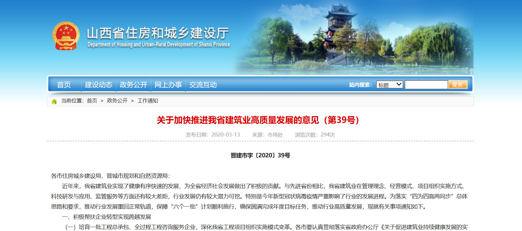 2020年3月13日,山西省住房和城鄉(xiāng)建設(shè)廳發(fā)布了《關(guān)于加快推進(jìn)我省建筑業(yè)高質(zhì)量發(fā)展的意見 》晉建市字〔2020〕39號,文中強(qiáng)調(diào):