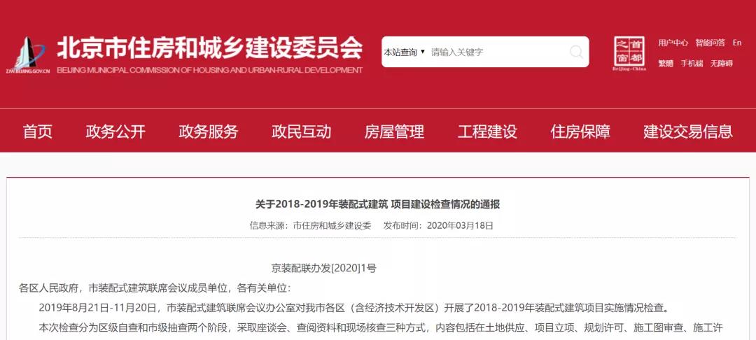 2020年3月18日,北京市發展裝配式建筑工作聯席會議辦公室《關于2018-2019年裝配式建筑項目建設檢查情況的通報》,內容強調: